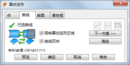 使用“摹仿变形”对话框的“曲线”选项卡可以选择曲线并指定摹仿变形:
