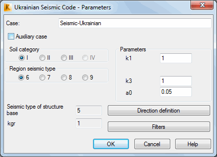 Parameters of a structure seismic analysis depend on a seismic code used during calculations of a structure influenced by seismic impact. Select Ukrainian seismic code in the New Case Definition dialog or click Parameters in the Analysis Type dialog.