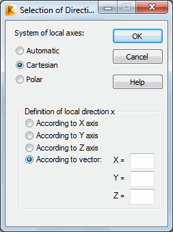 - Automatic. If selected, the local system of elements is adopted according to the system defined for each of the panels (see the description of the Local System Orientation dialog box).