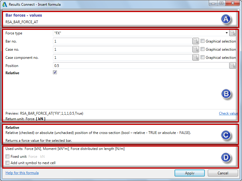During the definition of arguments, in the dialog you can see a preview of the syntax formula, you can see the return unit and you can also check the value returned for this formula.