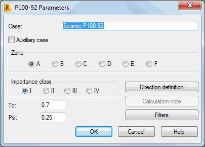 Parameters of a structure seismic analysis depend on a seismic code used during calculations of a structure influenced by seismic impact. Romanian seismic code P100-92 in the New Case Definition dialog or click Parameters in the Analysis Type dialog.