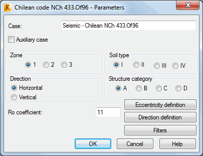 Parameters of a structure seismic analysis depend on a seismic code used during calculations of a structure influenced by seismic impact. Select Chilean Code in the New Case Definition dialog or click Parameters in the Analysis Type dialog.