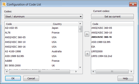 Use this dialog to set up the list of available codes for design codes and loads.