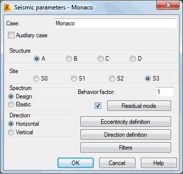 Parameters of a structure seismic analysis depend on a seismic code used during calculations of a structure influenced by seismic impact. Select Monaco seismic code in the New Case Definition dialog or click Parameters in the Analysis Type dialog.