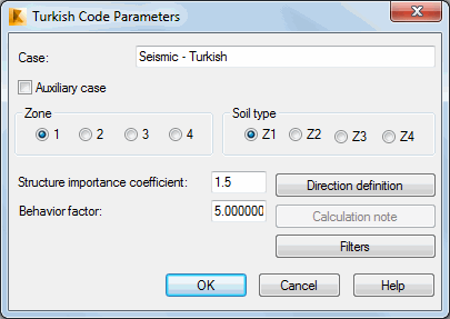 Parameters of a structure seismic analysis depend on a seismic code used during calculations of a structure influenced by seismic loads. Select the seismic Turkish code in the New Case Definition dialog or click Parameters in the Analysis Type dialog.