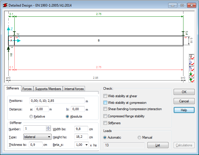 Use this option to perform detailed analysis of I-section members, rolled or welded. Access the option by clicking the Detailed button in the detailed results dialog for the EC3 code.