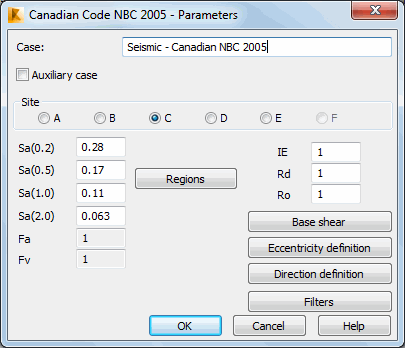 Parameters of a structure seismic analysis depend on a seismic code used during calculations of a structure influenced by seismic loads. Select Canadian seismic code NBC 2005 in the New Case Definition dialog or click Parameters in the Analysis Type dialog.