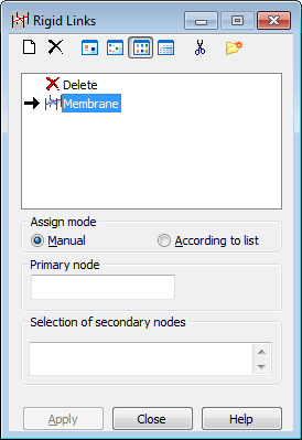 This option defines rigid links in a structure. A rigid link is used to model completely rigid elements of elastic structures (definition of a rigid body in a structure). Displacements and rotations defined for a rigid link can be limited to certain selected degrees of freedom.