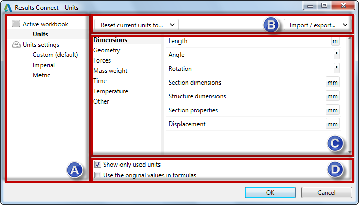 - The Reset current units to... drop-down list allows you to change the measurement system which will be used in the active workbook.