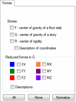 In this dialog, reduced forces (FX, FY, FZ, MX, MY, MZ) may be selected for presentation; these forces and moments are reduced to the center of gravity on each story for a given case. For each of the values above, the appropriate color and description (values of forces) can be selected.