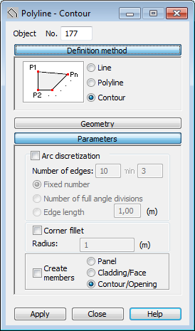- Graphic: click in the appropriate field under Geometry in the dialog, switch to the drawing area and click the point indicating the first point on the line, polyline, or contour and click the consecutive points.