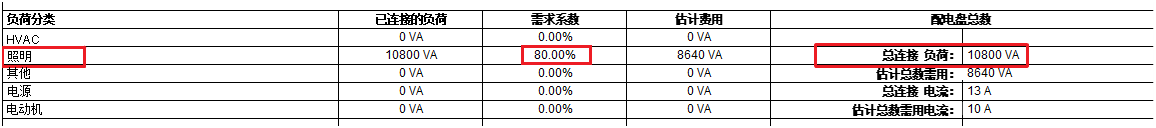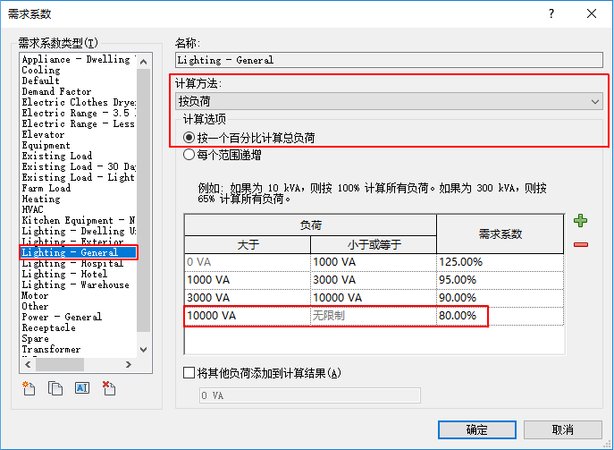 照明需求系数指定为按负荷计算,设置为按一个百分比计算总负荷。如果负荷大于 10000VA,则需求系数为 80%。