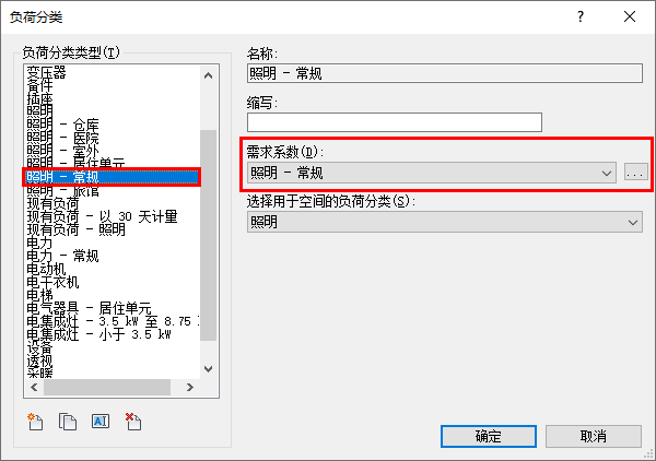 该照明需求系数已指定给相应的照明负荷分类类型。