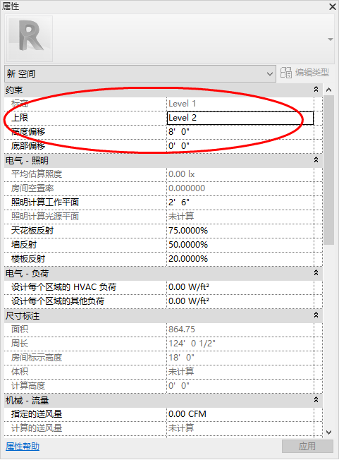 如果垂直长度超过房间边界图元(例如楼板或天花板),空间将捕捉到房间边界图元。 但是,拖曳控制柄和关联尺寸将指明指定的垂直长度,如下图所示。