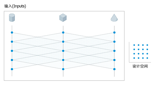 衍生式设计会根据分析类型定义的约束条件,使用指定变量在其定义范围内的随机值来生成结果。结果是一系列可能的解决方案,表示变量值的随机采样。