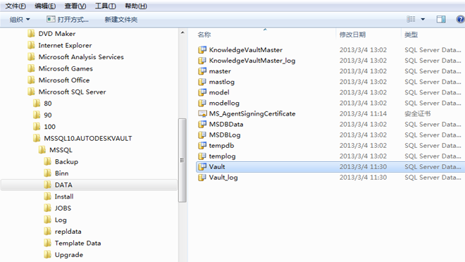 安装 Autodesk Vault Server 时,将创建一个名为 Vault 的 Vault。将在 Microsoft SQL Server 安装文件夹中的 MSSQL$AUTODESKVAULT\Data 文件夹中创建 Vault 的数据库文件。