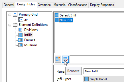 Use this procedure to delete an infill definition that you no longer need from the Infills definitions list. You cannot remove an infill definition when it is currently assigned to a cell. In addition, you cannot remove the default infill definition, but you can modify it as needed.