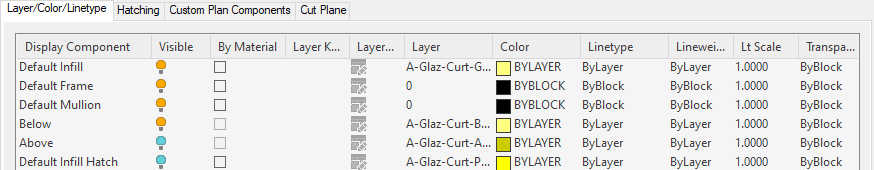 Use this procedure to specify the properties of one or more cut planes for a curtain wall style. Cut plane display properties apply only to display representations, such as Plan, that are used in Top view (Plan view) of a drawing.