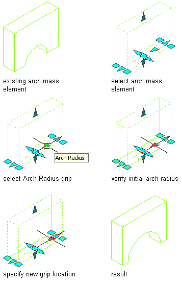 Use this procedure to change the radius of the arch within an Arch mass element using grips.