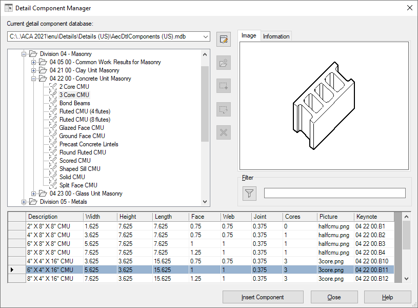 The Detail Component Manager dialog box with concrete mansonry table displayed
