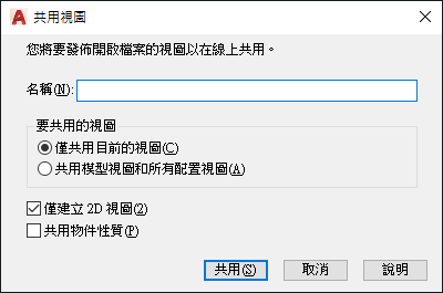 命名共用視圖。該名稱最多可包括 255 個字元,並可包括字母、數字、空格以及任何未被作業系統或此程式用於其他用途的特殊字元。
