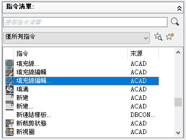 「指令清單」窗格包含可在目前載入的 CUIx 檔中使用的所有指令。您可以選取既有指令從清單以修改其性 質」或「建立新指令」。如果您想要建立新指令,指令會加入 CUIx 檔,並顯示在「<檔名> 中的自訂」窗格頂部附近的下拉式清單中。