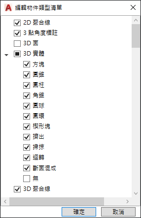 如果已勾選某個物件類型,在選取相同類型的物件時,以及 QPMODE 設定為 2 且 PICKFIRST 開啟時,則會在「快速性質」選項板上顯示該物件類型的性質。清除物件類型旁邊的勾選標記可以從「快速性質」選項板移除所選取的物件類型。