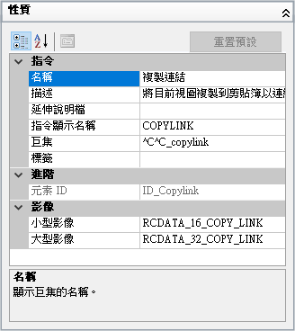 以下是在「複製連結」功能表項目的「名稱」性質加入一個波狀符號 (~) 之後,顯示在「編輯」功能表的結果。