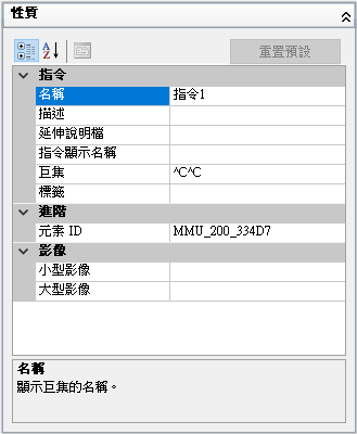 - 在「名稱」方塊中,輸入指令的名稱。加入至使用者介面元素後,該值會做為預設名稱,以及提示的一部分。