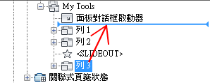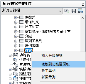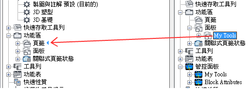 - 將新功能區面板從右側「<檔名> 中的自訂」窗格拖曳至左側「<檔名> 中的自訂」窗格中已載入 CUIx 檔的「面板」節點。