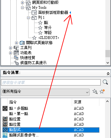 - 將指令從「指令」清單拖曳至面板上的「面板對話方塊啟動器」。
