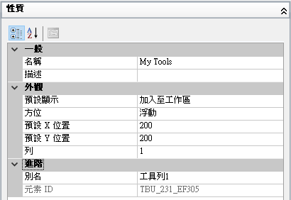 新工具列 (被命名為「工具列1」) 會置於「工具列」樹的底部。