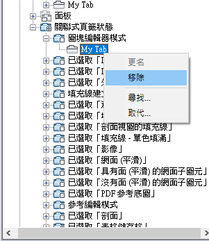 - 在關聯式頁籤狀態下的功能區頁籤上按一下右鍵,然後按一下「移除」。