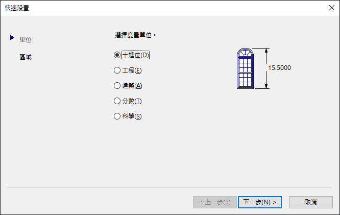 「快速設置」精靈包含兩個頁面:單位和區域。當您在此精靈中作業時,選取「上一步」和「下一步」可以切換畫面; 選取最後一頁的「完成」可以關閉精靈,並以您指定的設定來建立新圖面。
