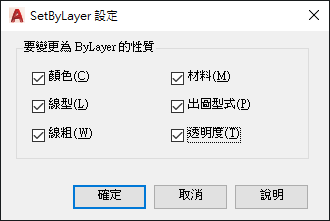 將所選物件與已解鎖圖層上插入的圖塊的顏色、線型、線粗、材料、出圖型式和透明度性質取代變更為「依圖層」。