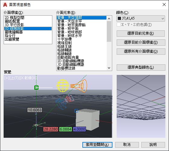 介面環境就是環境,例如模型空間。根據介面環境,可以為介面元素指定不同的顏色。您所選取的介面環境會顯示相關聯元素的清單。選取介面環境、介面元素,然後選取一種顏色。