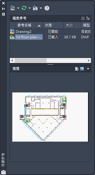 您可以在「外部參考」選項板中檢視有關貼附至圖面之參考底圖的檔案特定資訊。也可在該處載入與卸載參考底圖,以及執行其他作業。