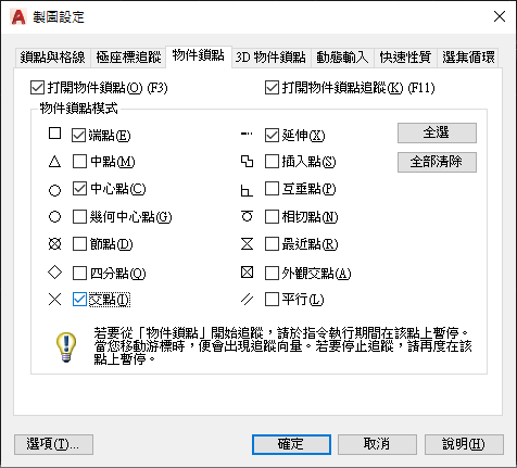 控制是否打開或關閉所有指定的物件鎖點模式。(OSMODE 系統變數)
