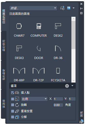 其他三個選項「最近使用的圖塊」、「我的最愛圖塊」和「資源庫中的圖塊」,會將「圖塊」選項板開啟到對應的頁籤。下圖顯示所有四個頁籤。