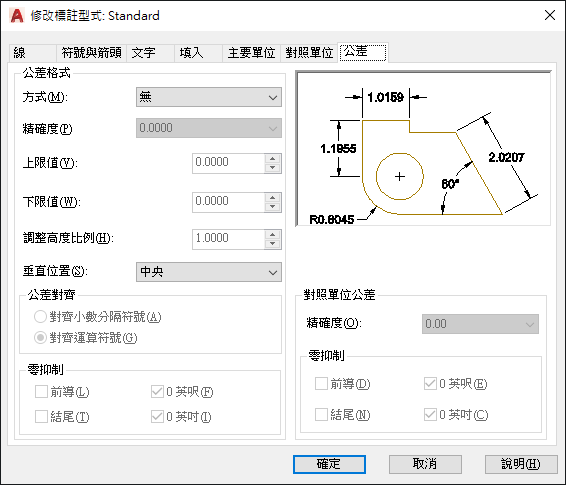 設定公差的計算方式。(DIMTOL 系統變數)