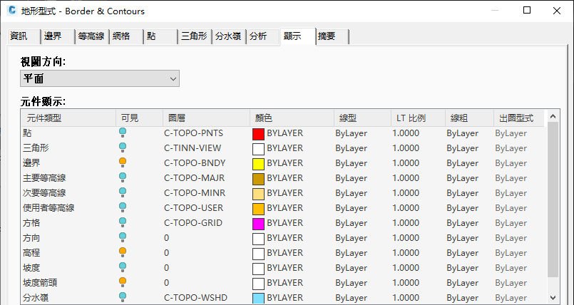 在「地形型式 - 既有地形等高線」對話方塊中,「邊界」、「主要等高線」和「次要等高線」元件將設定為可見。這些元件將確定地形在圖面中的顯示方式。啟用這些元件後,地形的顯示將如圖 6 所示。