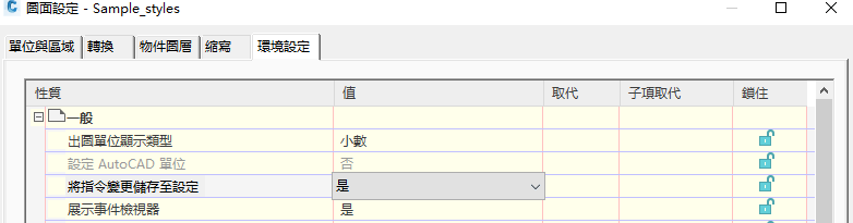 - 按一下「環境設定」頁籤,並展開「一般」性質。將「將指令變更儲存至設定」性質設為「是」,如圖 11 所示。