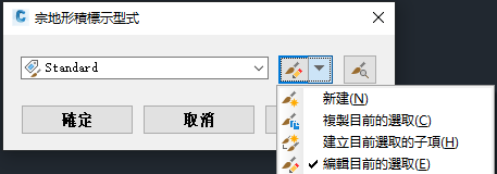 - 此作業將開啟「<物件>標示型式」對話方塊,如圖 12 所示,從中可以執行多個指令來建立新型式、複製既有型式或子系型式或者編輯目前選取的型式。