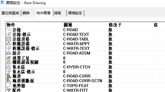 為了使處理更快,請凍結或關閉包括物件的圖面圖層。依預設,設計物件及其標示被劃分在多個圖層中。例如,定線、縱斷面以及其他道路設計物件分散在均以 C-ROAD 開頭的多個圖層中,如圖 5 所示。如果將道路設計物件合併至較少的圖層上,則打開或關閉它們將更加容易。