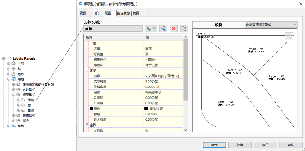標示型式可以包括文字、圖塊、直線、記號和引線。您可以在「標示型式管理員」對話方塊中預覽其外觀,如下圖所示: