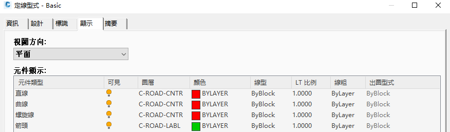 如果您習慣於透過操控圖層來控制物件,則可以將各種物件型式的「元件顯示」設定設定為「依圖層」。這樣,您即可使用 AutoCAD Layer 指令輕鬆地變更圖層設定,而不必透過編輯型式來變更物件元件的顏色、線型、線粗或出圖型式。