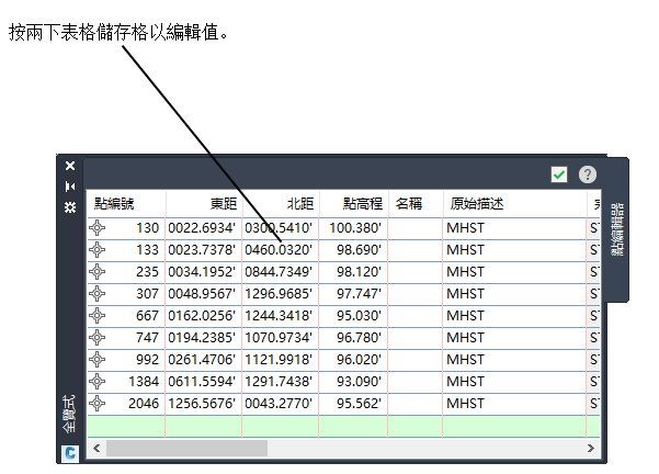 某些物件類型 (例如定線和縱斷面) 使用全覽式視窗來顯示組成此物件的圖元表格。