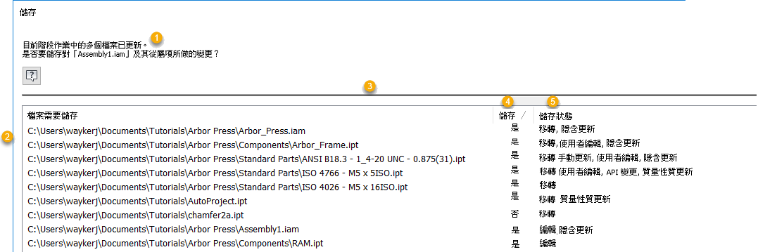 關閉檔案時,「儲存」對話方塊會顯示因開啟檔案而受某些影響的檔案清單。有時,系統層級的變更極少或不會遺失任何設計意圖,如果未儲存這些變更,可在稍後儲存。有時,不需要提示儲存。新的儲存設定可讓您進一步控制 Inventor 何時提示您儲存。