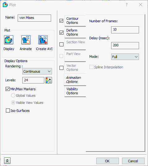 - 輪廓選項:此區段可讓您選擇要在動畫期間出圖的結果資料。可以指定最大值和最小值範圍以及其他彩現類型。