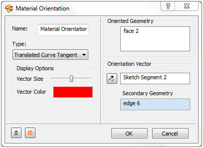 在此方式中,會沿著方位向量平移曲線,使其在元素原點前面。某點最接近元素原點的切線會投影在元素 X-Y 平面來計算材料方位。